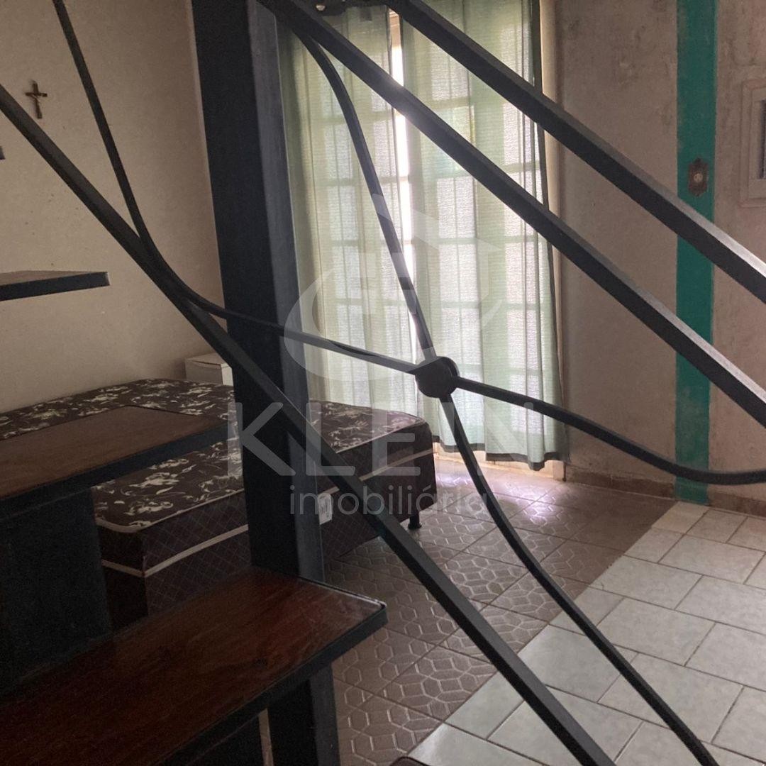 Casa em alvenaria com 01 dormitório com mezanino, 01 banheiro, 01 sala e ampla garagem com cozinha.
