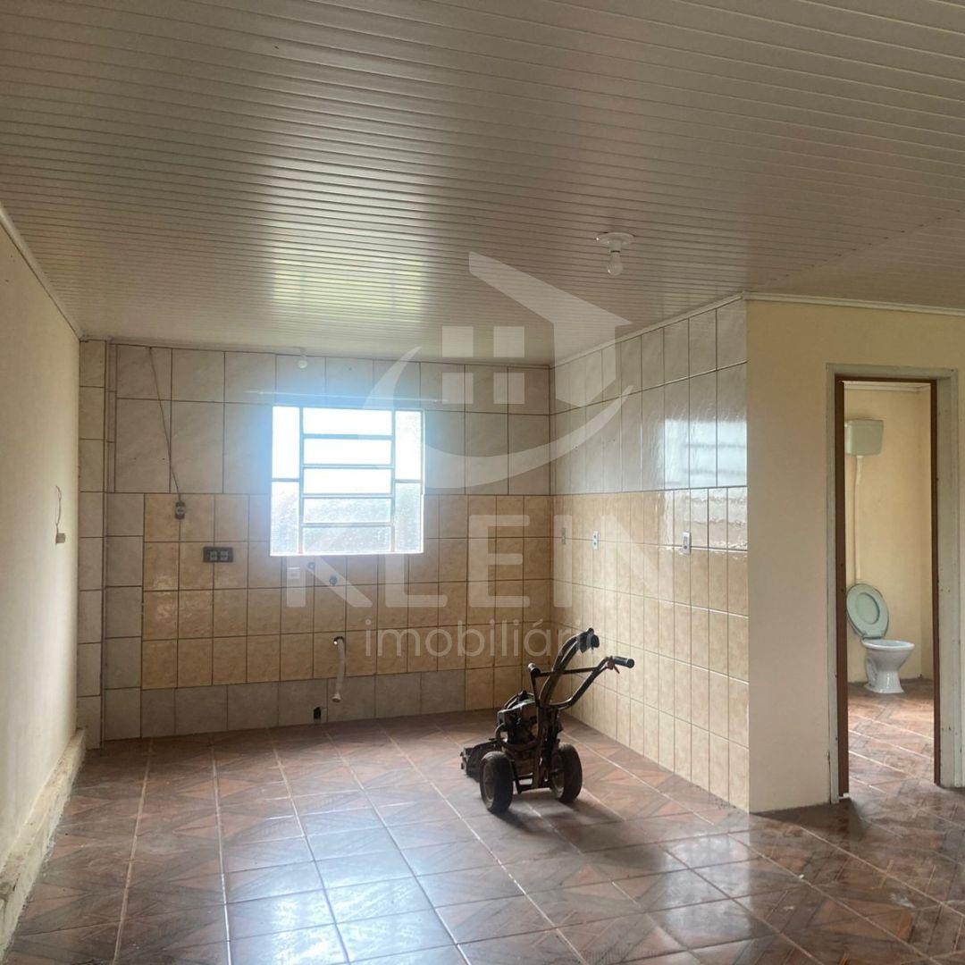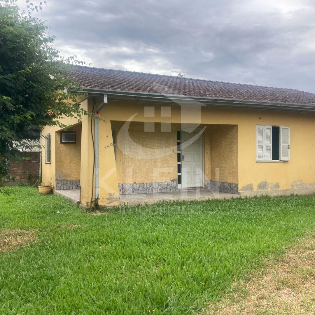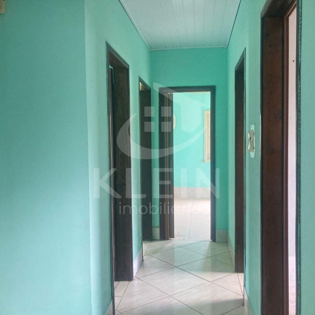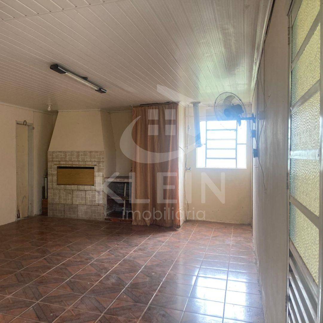 Casa em alvenaria com três dormitórios, dois banheiros, sala de estar e sala de jantar, ampla cozinha com churrasqueira.