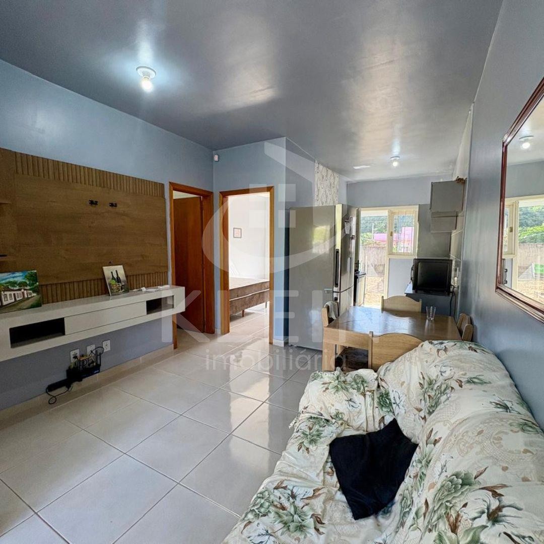 Casa em alvenaria, com 02 dormitórios, 01 sala/cozinha, 01 banheiro, 01 área de serviço e garagem.