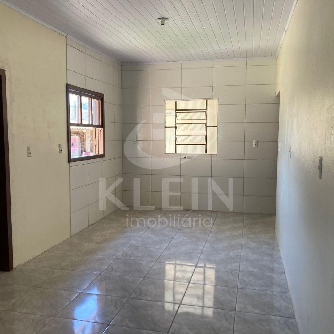 Casa em alvenaria com 2 dormitórios, 1 sala, 1 cozinha, 1 banheiro, 1 área de serviço e 1 garagem.